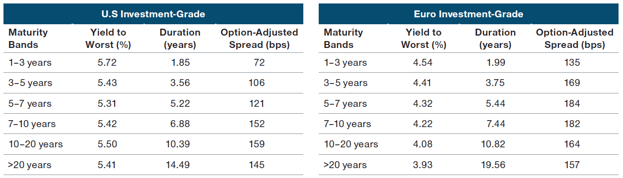 As of June 30, 2023. Past performance is not a reliable indicator of future performance. The index used for U.S. investment grade is the Bloomberg U.S Corporate Bond Index and the index used for Euro investment grade is Bloomberg Euro Aggregate—Corporate Bond Index. Source: Bloomberg Finance L.P.