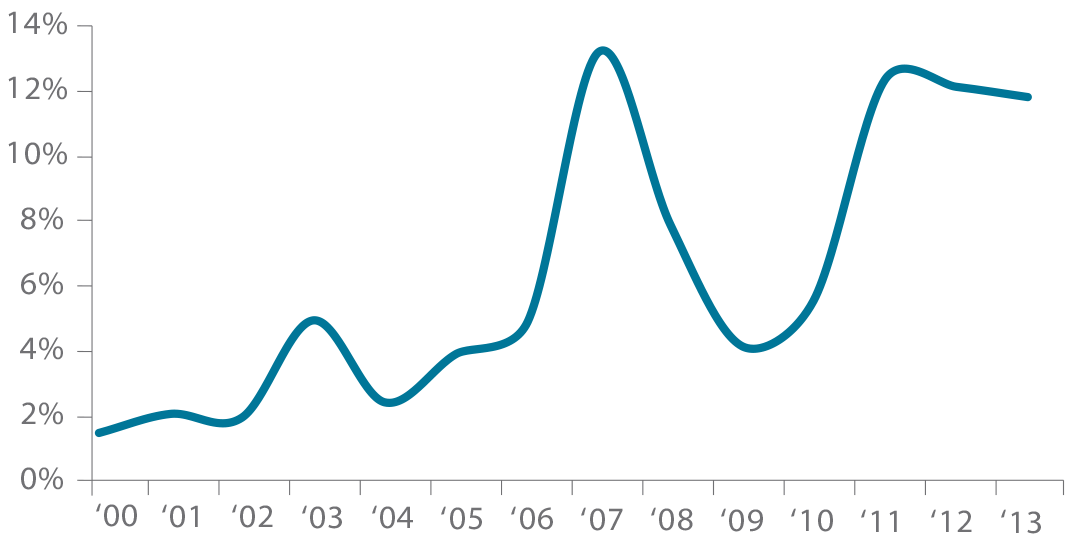 Co-investing is the practice of making non-control direct equity investments in individual transactions alongside general partners who source, or sponsor, the deal (“GPs” or “Sponsors”). Co-investing became institutionalized in the mid- to late 1990s as the overall private equity industry began to mature and has become a more prevalent allocation in investors’ portfolios. According to StepStone’s analysis, coinvestment dollars represented 13% of total equity invested in 2012, up from 1% in 2000 and on par with 2007, as shown in Figure 1.