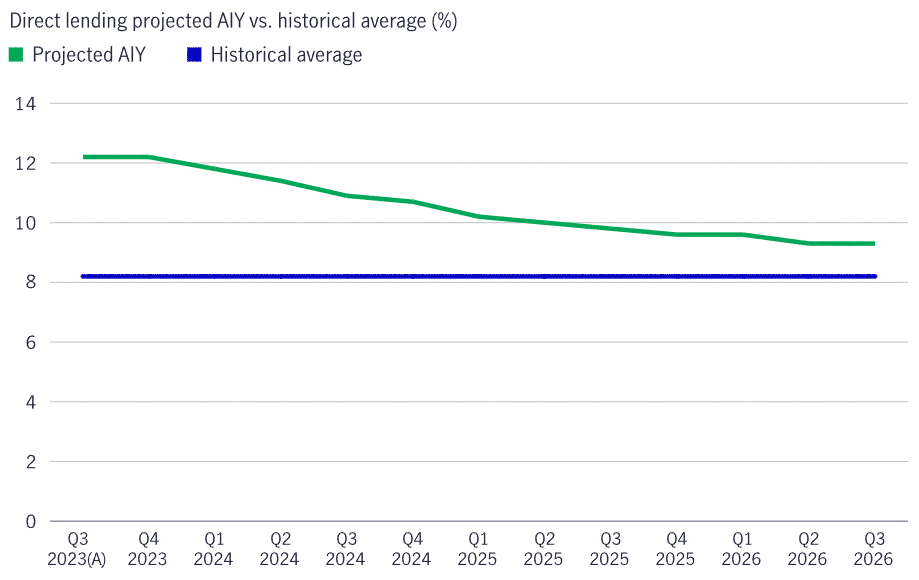 Source: Manulife Investment Management, as of November 30, 2023. AIY stands for all-in yield. (A) refers to actual Q3 2023 data.We expect all-in yields to remain above 10% throughout the next year—and to average 10% over the next three years.3 Offering the potential for attractive yields, reduced volatility, and portfolio diversification, direct lending combines characteristics unlikely to be matched by other investments in the year ahead.1 PitchBook, December 31, 2022. 2 The Wall Street Journal, November 10, 2023, wsj.com/finance/how-risky-is-private-credit-analysts-are-piecing-together-clues-79762038?st=69cqpayifvhrup4&reflink=desktopwebshare_permalink. 3 Manulife Investment Management, as of November 30, 2023.Read More From Manulife HereInvesting involves risks, including the potential loss of principal. Financial markets are volatile and can fluctuate significantly in response to company, industry, political, regulatory, market, or economic developments. The information provided does not take into account the suitability, investment objectives, financial situation, or particular needs of any specific person.All overviews and commentary are intended to be general in nature and for current interest. While helpful, these overviews are no substitute for professional tax, investment or legal advice. Clients and prospects should seek professional advice for their particular situation. Neither Manulife Investment Management, nor any of its affiliates or representatives (collectively “Manulife Investment Management”) is providing tax, investment or legal advice. This material is intended for the exclusive use of recipients in jurisdictions who are allowed to receive the material under their applicable law. The opinions expressed are those of the author(s) and are subject to change without notice. Our investment teams may hold different views and make different investment decisions. These opinions may not necessarily reflect the views of Manulife Investment Management. The information and/or analysis contained in this material has been compiled or arrived at from sources believed to be reliable, but Manulife Investment Management does not make any representation as to their accuracy, correctness, usefulness, or completeness and does not accept liability for any loss arising from the use of the information and/or analysis contained. The information in this material may contain projections or other forward-looking statements regarding future events, targets, management discipline, or other expectations, and is only current as of the date indicated. The information in this document, including statements concerning financial market trends, are based on current market conditions, which will fluctuate and may be superseded by subsequent market events or for other reasons. Manulife Investment Management disclaims any responsibility to update such information. Manulife Investment Management shall not assume any liability or responsibility for any direct or indirect loss or damage or any other consequence of any person acting or not acting in reliance on the information contained here. This material was prepared solely for informational purposes, does not constitute a recommendation, professional advice, an offer or an invitation by or on behalf of Manulife Investment Management to any person to buy or sell any security or adopt any investment approach, and is no indication of trading intent in any fund or account managed by Manulife Investment Management. No investment strategy or risk management technique can guarantee returns or eliminate risk in any market environment. Diversification or asset allocation does not guarantee a profit or protect against the risk of loss in any market. Unless otherwise specified, all data is sourced from Manulife Investment Management. Past performance does not guarantee future results. This material has not been reviewed by, and is not registered with, any securities or other regulatory authority, and may, where appropriate, be distributed by Manulife Investment Management and its subsidiaries and affiliates, which includes the John Hancock Investment Management brand. Manulife, Manulife Investment Management, Stylized M Design, and Manulife Investment Management & Stylized M Design are trademarks of The Manufacturers Life Insurance Company and are used by it, and by its affiliates under license.3266591
