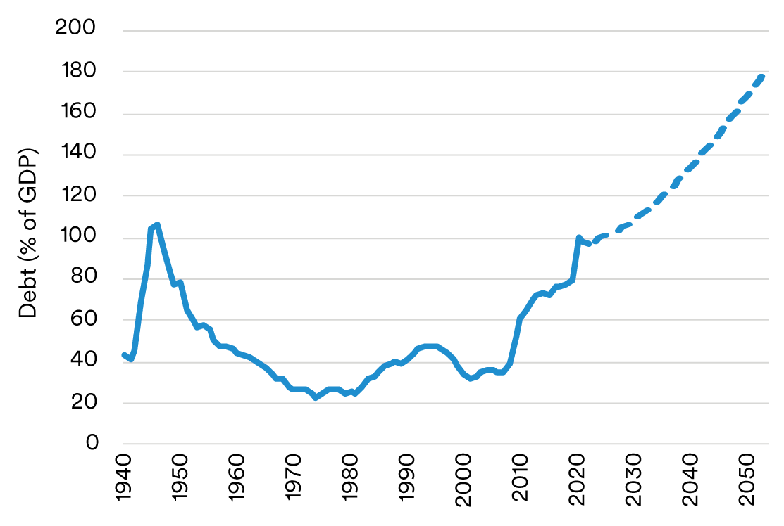 Fiscal concerns remain high, and we expect them to remain on a short list of worries beyond any government funding resolution that happens in November. The current continuing resolution bill extends government funding to November 17. The lack of a House Speaker and the looming 2024 election year both add obstacles to the process and increase the risk of a shutdown in November. Additionally, credit rating agencies have been more focused on the processes surrounding budget approvals rather than relying solely on financials. As such, a government shutdown or continued difficulty in passing a budget could put the U.S. credit rating under further scrutiny, especially given ballooning debt and net interest payments (see Figure 2 below).1