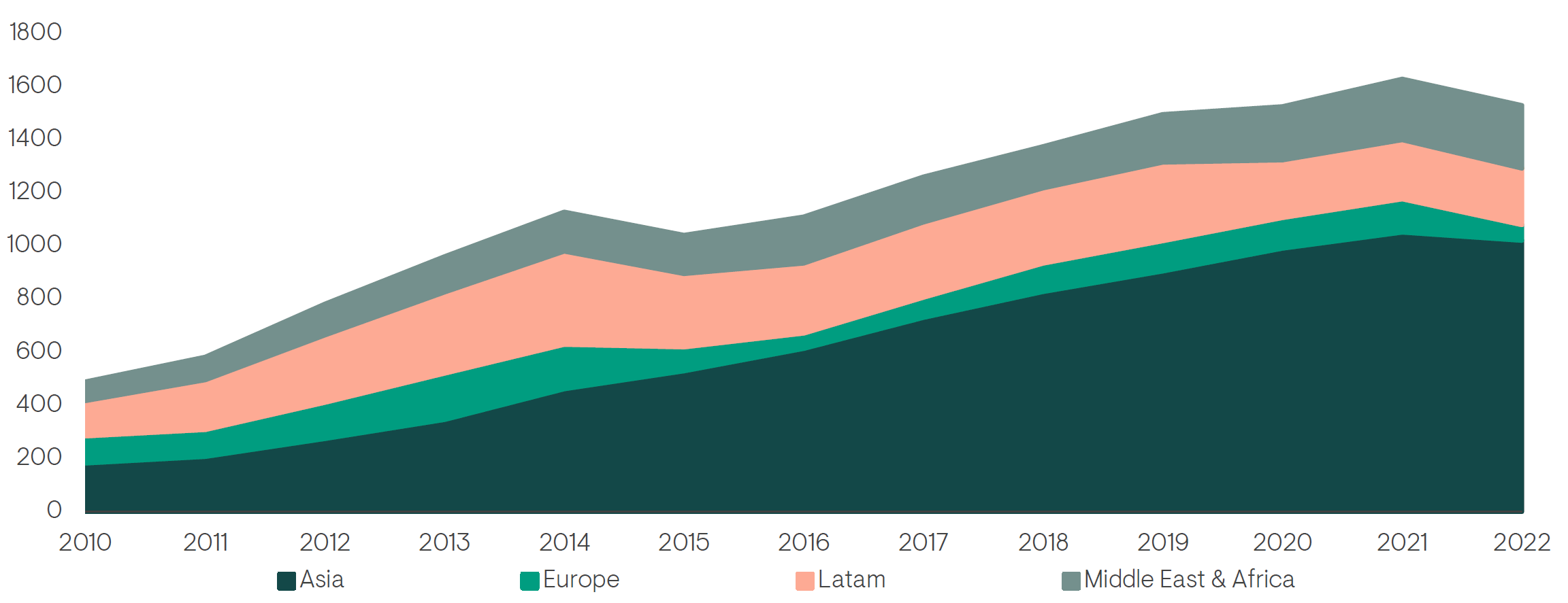 As emerging markets have grown substantially over the past two decades, emerging market-based corporations have turned to international capital markets to help fund and grow their businesses. As a result, JP Morgan launched a suite of emerging market corporate debt indices in 2008. From a market cap of less than US$500 billion in 2010, the investment-grade portion of the entire asset class has grown to c.US$1.6 trillion1 today across 29 countries. While asset class net issuance has turned negative in 2022, this is likely a shorter-term phenomenon and the actual path of growth is likely to continue. The investment universe is diversified globally across regions, countries, and sectors, with lower leverage than comparably rated developed market peers. We believe this fast-growing and increasingly diverse asset class – which has higher yields, lower duration and less leverage than US investment-grade debt for comparable credit quality – could provide a high-grade complementary solution for institutional investors.Fig 1. Growth in EM IG corporate bonds (US dollar, billion)
