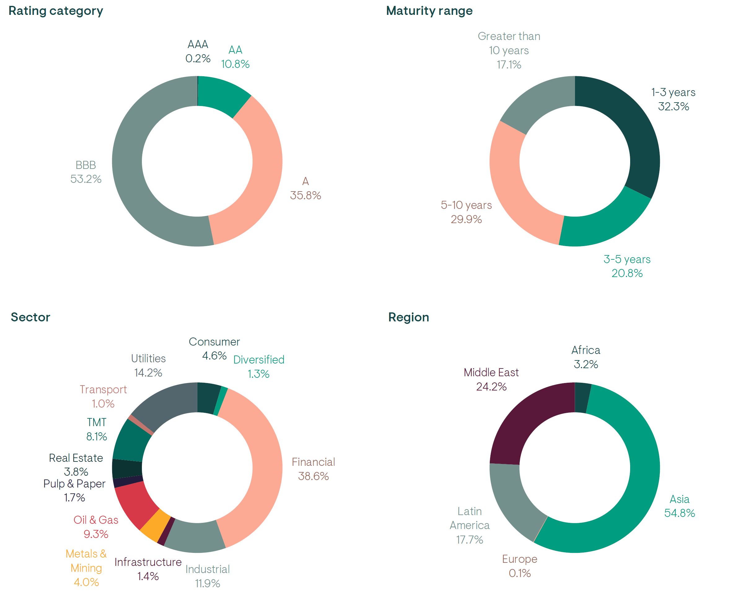 Fig 2. JPMorgan CEMBI IG rating, maturity, sector and regional breakdown