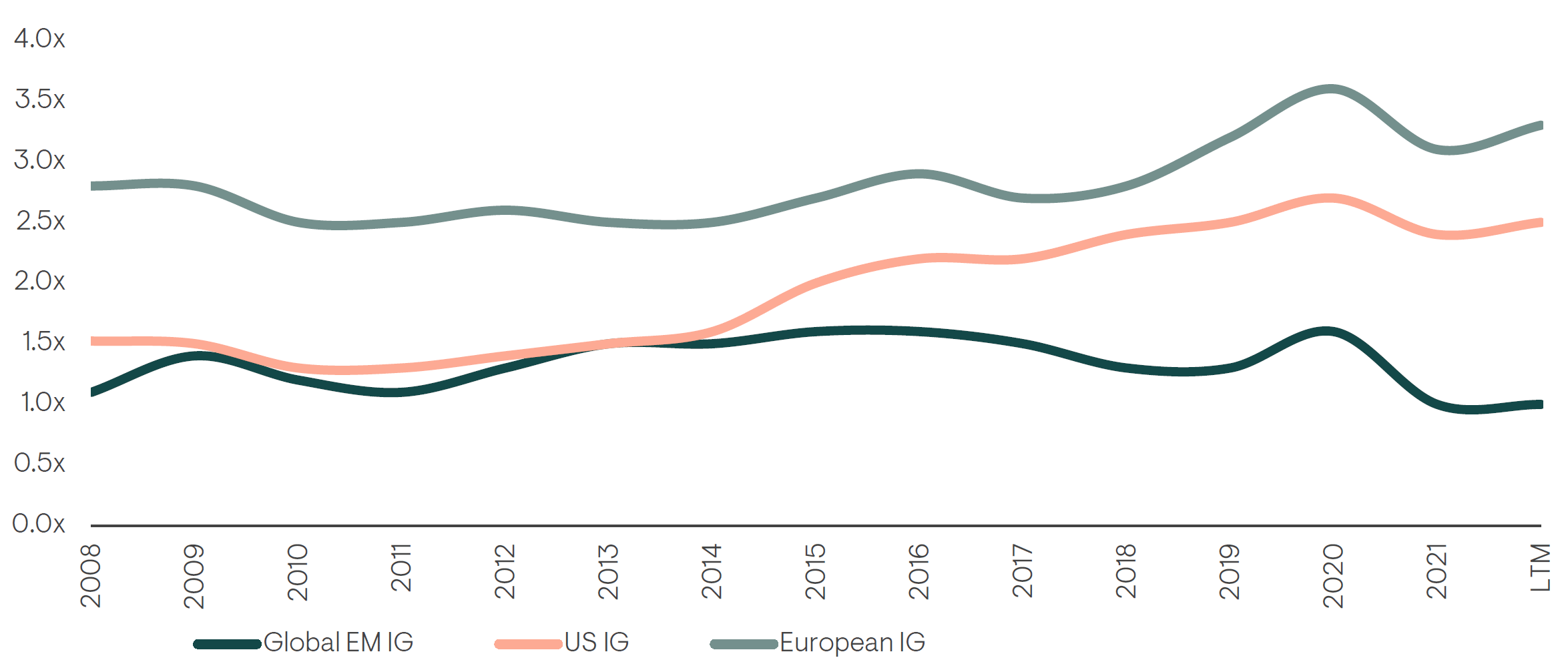 Through time, emerging market companies have on average maintained better credit fundamentals than their similarly rated developed market peers, as they have needed to maintain resilience during times of challenging macroeconomic backdrops. Head-quartered and operating in emerging markets, these companies are familiar with volatility and have historically experienced periods when they struggled to finance themselves with longer-term debt. Thus, their short-term debt is higher as a percentage than it is in developed markets, and their refinancing risks have historically been higher. This has led to a culture of retaining cash while containing leverage. This has been particularly evident since the COVID-19 crisis, as many companies have pared back their expansion and capital expenditure, leaving them with healthy cash balances and strong buffers. While higher refinancing risks would typically be a fundamental challenge in a rising rate environment – as there is a need to refinance at higher costs – such pressure on EM corporates is meaningfully lower in this cycle relative to prior cycles as most issuers have been able to pre-finance in the ultra-low interest rate regime of the past three years. This has left them well-placed from a financing perspective over the short and medium term.Fig 3. EM vs. US and European IG net leverage comparison