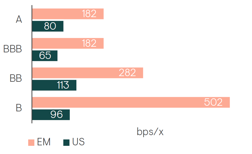 Investors often perceive emerging market companies to be riskier because of their domestic operating environments. Although rating agencies account for this, premiums still exist for EM companies with better credit metrics than developed market peers; in effect, a ‘zip-code premium’. Figure 5 shows this by comparing the spread-per-turn of leverage offered by emerging and developed market companies. EM company financial strength has led to many improving credit stories, but sovereign credit deterioration/policy shifts have stymied some positive ratings actions and led to downgrades of corporates in some instances. EM companies retain access to multiple financing sources such as equity, local currency bonds and loans, yet many are capped by the rating of their governments; despite the superior fundamentals, their geography effectively drags down the rating. This creates compelling valuation opportunities for investors. The temporary spike in leverage seen by EM companies in 2020 has reversed. Net leverage remains lower than it is in the US across rating buckets, and deleveraging through 2021 and beyond has resulted in many EM companies’ leverage metrics reaching multi-year lows.Fig 4. EM Corporates exhibit lower level of leverage than US across most rating buckets