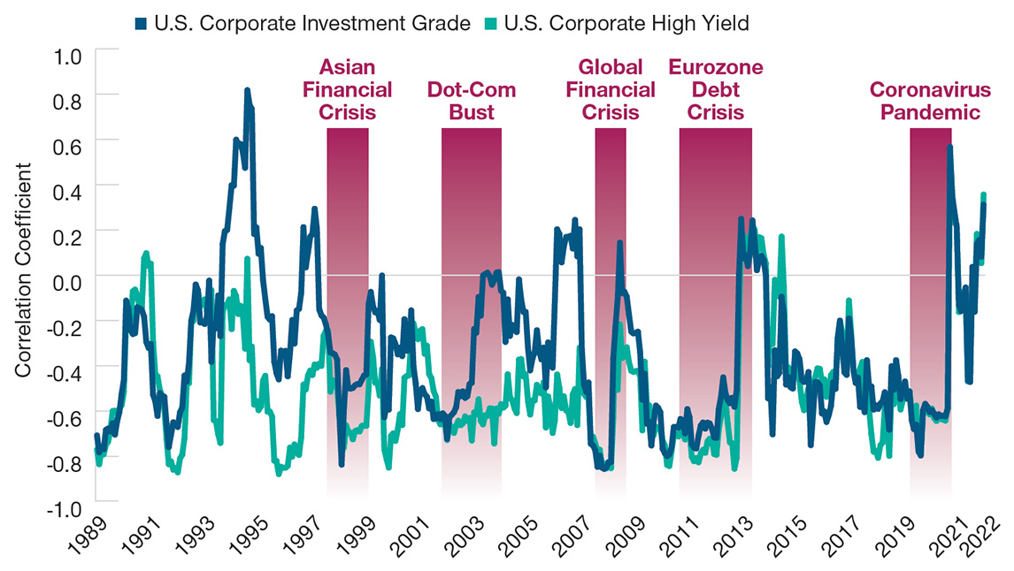 Because high-quality government debt tends to rally in periods of deteriorating risk sentiment, duration can also serve as a hedge against credit risk. Given the positive correlation between Treasuries and risk assets during the downturn in the first half of 2022, some observers have questioned the effectiveness of duration as a hedge for credit risk.