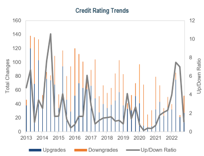 • Companies are beginning to shift focus. The narrative around inflation and its impact on specific sectors is slowly shifting to earnings amidst a potential recession. According to FactSet, the materials, consumer discretionary, and communications sectors are expected to see a decline in earnings next year, while the energy and industrial sectors are expected to see some of the highest earnings growth. Slower growth will likely mean we have seen the peak in credit fundamentals and should expect modest deterioration throughout 2023. This is beginning to show up in credit rating trends with the pace of upgrades slowing.