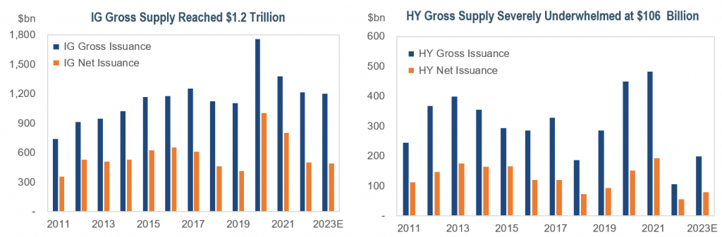 • Supply should reach similar levels in 2023. Expectations are for supply to be in line with 2022, with a slight decrease in net issuance. M&A supply should be a relatively small portion of overall volume as less deal activity is expected next year.