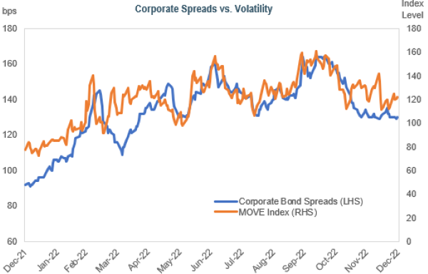 As we enter 2023, there is growing uncertainty in whether the US economy can withstand restrictive monetary conditions for much longer without falling into a recession. Although inflationary pressures appear to have peaked, there are signs of weakening demand and slower growth. However, investment-grade corporate fundamentals are beginning the year in a position of strength – leverage and coverage ratios are at healthy levels – which should help most issuers navigate a deteriorating market. With any economic downturn, though, there would likely be an inconsistent impact across sectors and issuers. We believe the likelihood of increased dispersion lends itself to our experience as disciplined, bottom-up security selectors.Sources: Bloomberg as of 12/31/22, JP Morgan as of 12/14/22 and 12/15/22, and FactSet as of 1/13/23. The viewscontained in this report are those of IR+M and are based on information obtained by IR+M from sources that are believed to be reliable but IR+M makes no guarantee as to the accuracy or completeness of the underlying third-party data used to form IR+M’s views and opinions. This report is for informational purposes only and is not intended to provide specific advice, recommendations, or projected returns for any particular IR+M product. No part of this material may be reproduced in any form, or referred to in any other publication, without express written permission from Income Research + Management. “Bloomberg®” and Bloomberg Indices are service marks of Bloomberg Finance L.P. and its affiliates, including Bloomberg Index Services Limited (“BISL”), the administrator of the index (collectively, “Bloomberg”) and have been licensed for use for certain purposes by IR+M. Bloomberg is not affiliated with IR+M, and Bloomberg does not approve, endorse, review, or recommend the products described herein. Bloomberg does not guarantee the timeliness, accurateness, or completeness of any data or information relating to any IR+M product.Printable Version