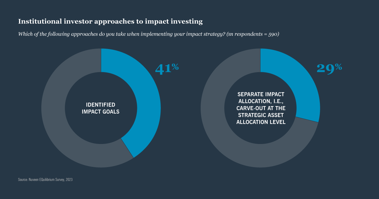 Understanding the non-financial impact of their investments is an increasing concern for institutional investors. Almost three-quarters (74%) consider or plan to consider the environmental and societal impact of their investment decisions, according to Nuveen’s 2023 EQuilibrium survey of institutional investors around the world. This number is even higher (82%) for insurers. While the demand to fund impact projects and investments, especially from insurers, is clear, implementation can be challenging. Only 41% of impact-focused investors had identified impact goals for implementing their impact strategy in our EQuilibrium survey, and less than one-third had a separate allocation sleeve for their impact investments.