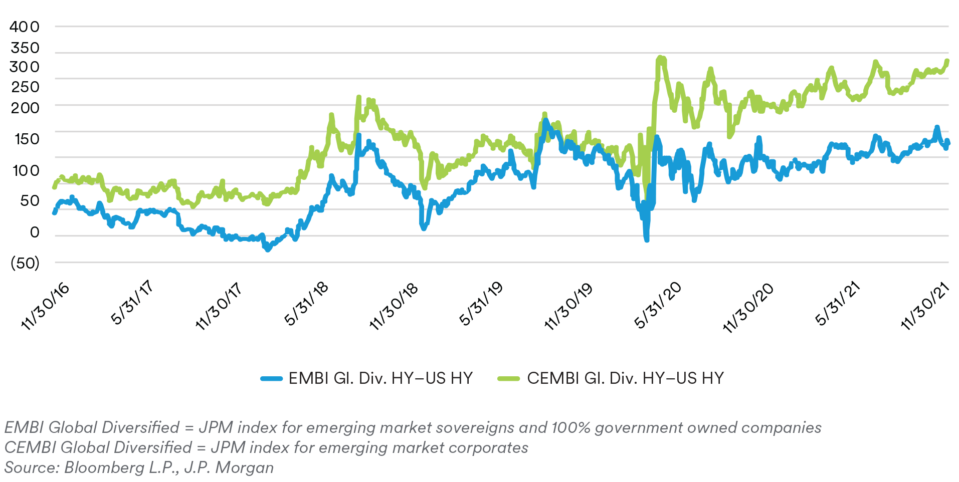 Despite a strong recovery thus far in the asset class, we believe there are still attractive opportunities across EM at these valuations as some credits have been over penalized in this downturn and have lagged in the ascent. The key is to differentiate those sovereigns and corporates that have sufficient buffers to withstand near-term liquidity pressures on a gradual road to recovery. Recently, the spread differential between EM and DM widened as EM underperformed DM in the second half of 2021. Concerns about a China slowdown driven by the property sector weighed on EM as a whole. The widening differential leaves room for potential spread compression over the coming quarters, as we continue to see supportive policy measures even in the face of Federal Reserve tapering. Over the coming months, as we anticipate more clarity on both U.S. taper policy and China’s policy response, there should be an opportunity to capitalize on the spread differentials between EM and DM. Security selection and country rotation will be key for any EM investor, as not all opportunities are created equally, and the dispersion in returns could be significant.