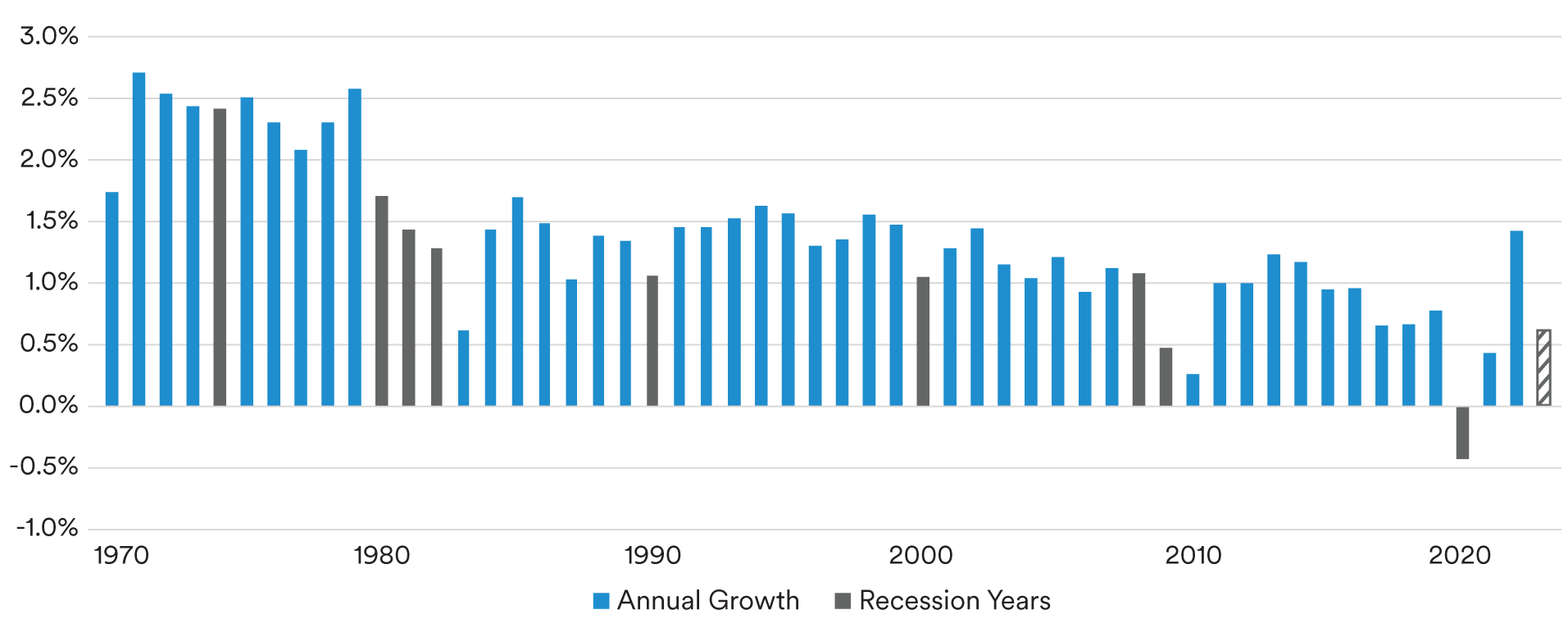 Taken together, we expect a mild recession in 2023 but still slightly positive GDP growth of +0.9% for the full year. This compares to the more severe 2008 recession when calendar-year GDP declined by 1.6%. Given these positive and negative risks, how should real estate investors position portfolios and seek new opportunities in 2023?