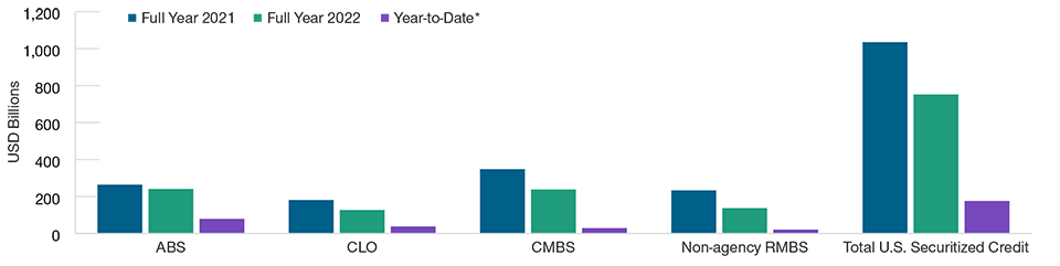 9 Source for ABS, CLO, CMBS, and RMBS issuance totals: JP Morgan. All totals in U.S. dollars as of April 28, 2023.