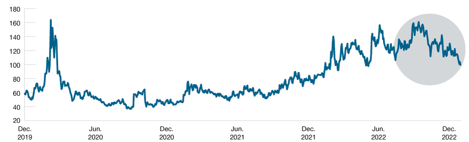(Fig. 1) Volatility levels had neared March 2020 COVID peak before easing in late 2022