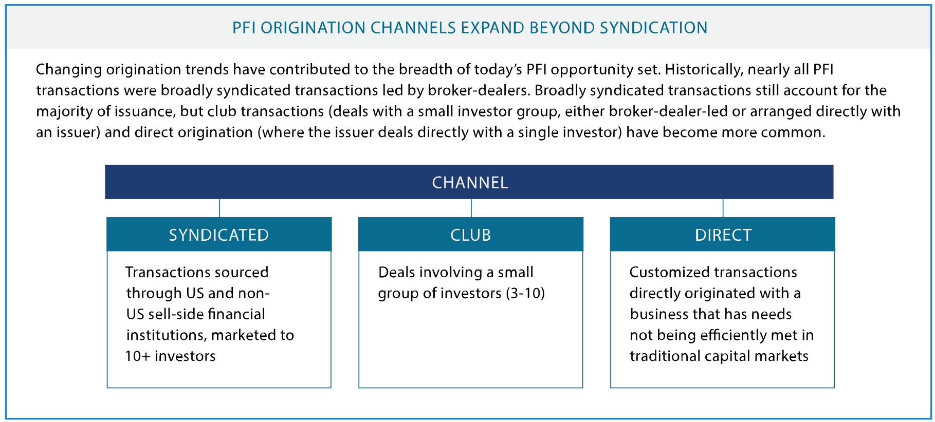 • Strong relationships and a deep origination pipeline. The ability to source distinct opportunities is a differentiator in PFI. A wide network and credibility with both broker-dealers and issuers helps a manager get a first look at new transactions and a stronger position in the origination pipeline. Seeing a large volume of potential transactions can enable a manager to be highly selective, which we feel is essential to building a quality PFI portfolio.