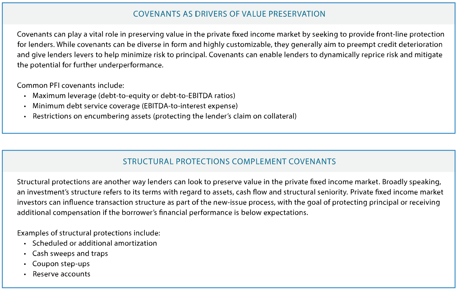 • Yield premia are dynamic. PFI’s yield advantage is comprised of an illiquidity premium and a complexity premium. The complexity premium is typically more constant, being a function of deal structure, while the illiquidity premium fluctuates as market conditions change. Hence, we think it is important to stay invested through the market cycle and avoid attempts at market- timing. Additionally, PFI can offer value through the cycle, not just when illiquidity premiums are high. In our view, it should not be seen as only a yield play. Covenants may be able to provide downside mitigation when it is needed most, and the asset class is a source of significant diversification potential. For these reasons, we believe PFI should be a staple allocation in an insurance company’s portfolio, not an opportunistic play.