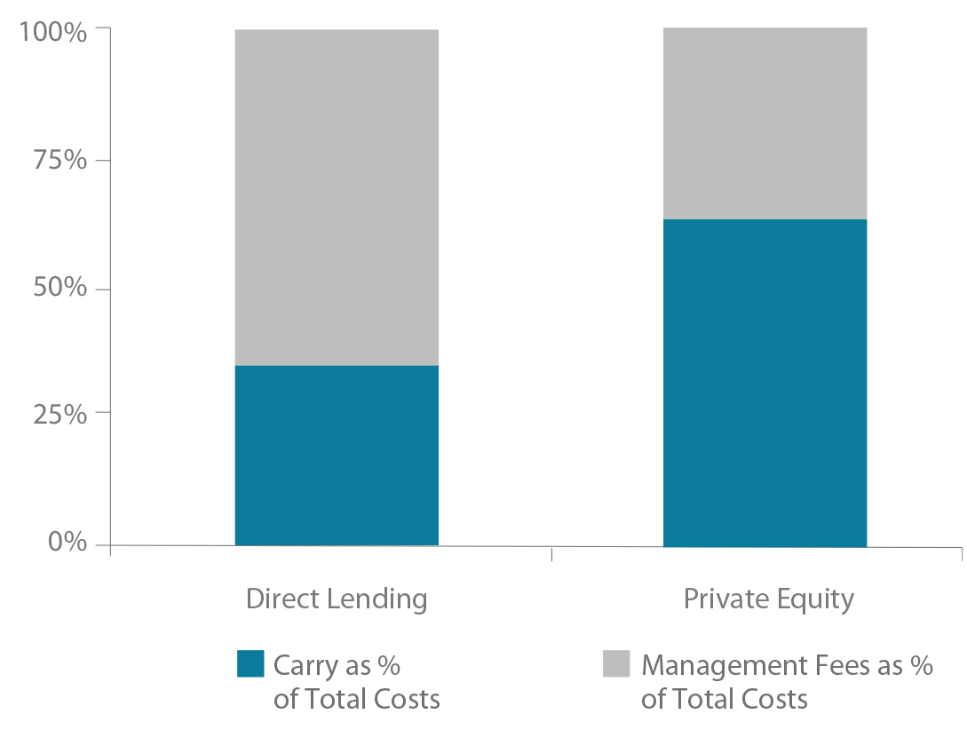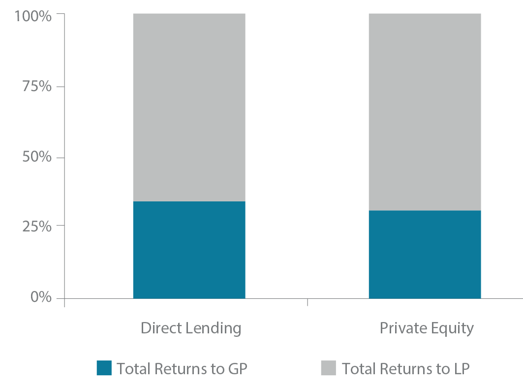 Figure 7 illustrates a slight difference in the percentage of gross returns that private equity and direct lending managers are paid. But is this appropriate? Perhaps: Investors have very different return expectations for each asset class, potentially creating a perception issue given the difference in return profiles. Paying one-quarter of your returns to an income-generating manager can be justified if investors consider the value of diversification to their portfolio, capital protection, and the stability of those returns rather than just focusing on return enhancement.