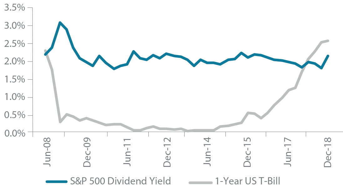 After the global financial crisis, investing heavily in public equities was a worthwhile strategy, providing attractive total returns as well as a competitive dividend yield. In the last few years, however, this too has changed. With yields from public equities below that of government bonds (Figure 1), where are CIOs to turn in the hunt for yield?FIGURE 1 | S&P TRAILING 1-YEAR YIELD VS 1-YEAR T-BILL