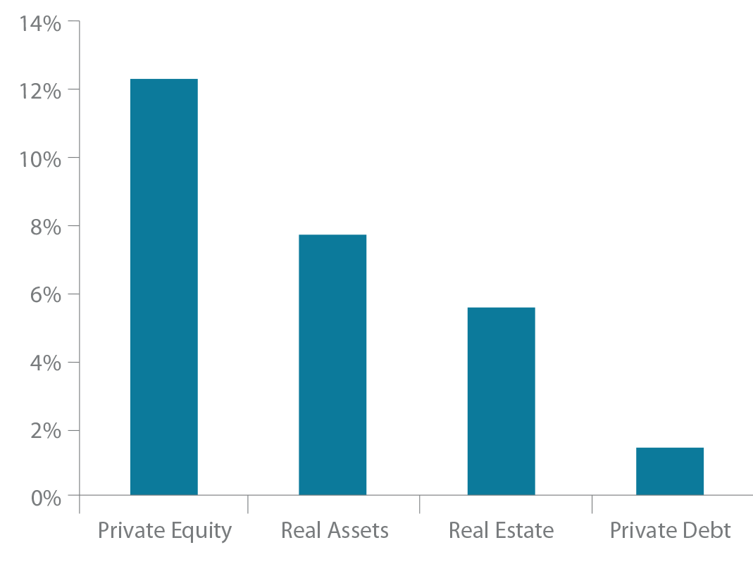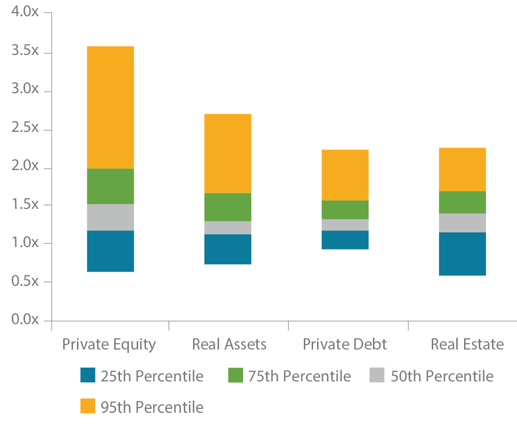 75th percentiles. Private Debt excludes distressed and mezzanine strategies and Private Equity comprises buyout and growth equity strategies.