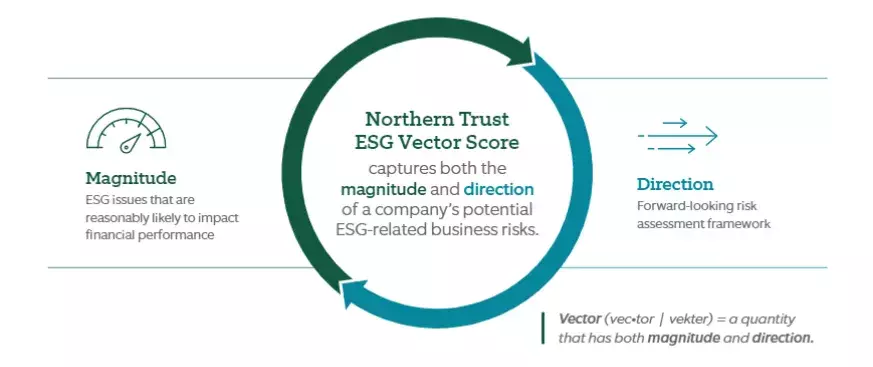 The Northern Trust ESG Vector Score is a measurement that assesses publicly traded companies in the context of financially relevant environmental, social and governance (ESG) related criteria that could impact their operating performance.