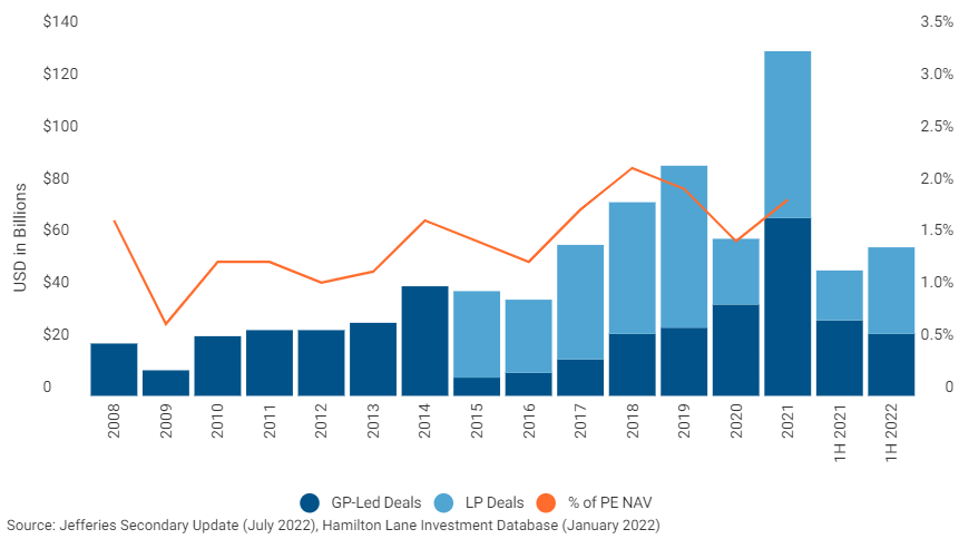 On this slide we show secondary market volume over the past 15 years. You can see the growth. It certainly hasn’t been in a straight line upwards each year, but over the past 15 years it has grown at a 15 to 20% compound annual rate. Last year was a record year for volume, and despite weaker macro conditions and lower secondary pricing this year, the volume in the first half was still higher than last year’s record. Notice that beginning in 2015, we show volume separated between LP deals and GP-led deals. The secondary market is now generally characterized by these two types of deals. LP deals are the traditional secondary deal, where a buyer becomes a replacement LP. On the other hand, a GP-led secondary is a transaction initiated by a GP that impacts all LPs in the fund. The most common form is a continuation fund in which secondary buyers purchase one or more assets from an existing fund. As for why you should care, it is because the market has exploded. GP-led secondaries in 2021 were larger than the entire secondary market just four years ago. So, what’s driving the growth of the overall market? We’ll explore three themes.Read the Full Article Here