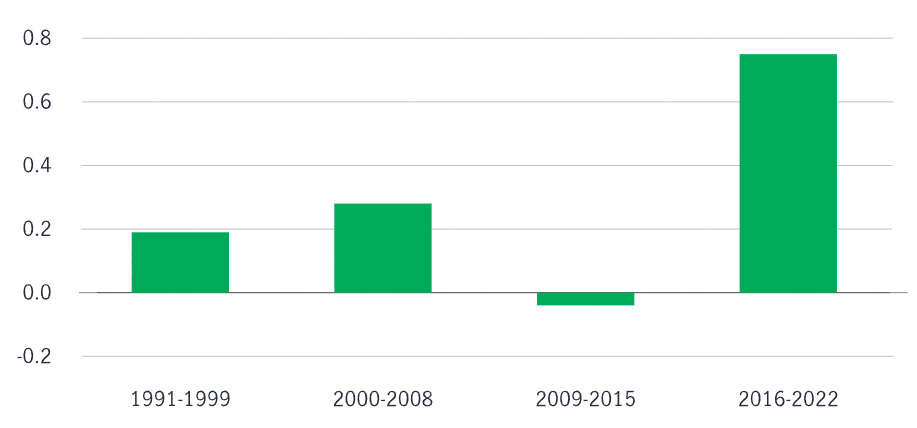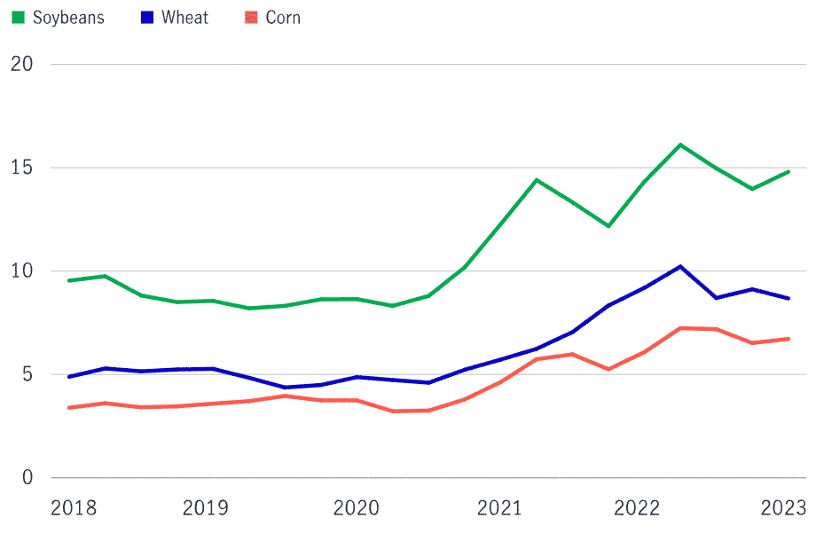 Source: Agricultural Resource Management Survey (ARMS) farm financial and crop production practices, August 30, 2021. Precision agriculture adoption includes the use of yield monitors, yield maps, guidance systems, as well as fertilizer, seed, and pesticide application with variable-rate technology. Missing years' values were replaced using extrapolated averages between data points in the ARMS survey. Average yield represents the average value of the trailing three years. USDA data is limited to 2010 for corn.The relatively consistent crop yield growth of the past two decades is evidence of this continuous innovation and due partly to the application of improved genetics and the development of drought-tolerant varieties, along with the increased implementation of